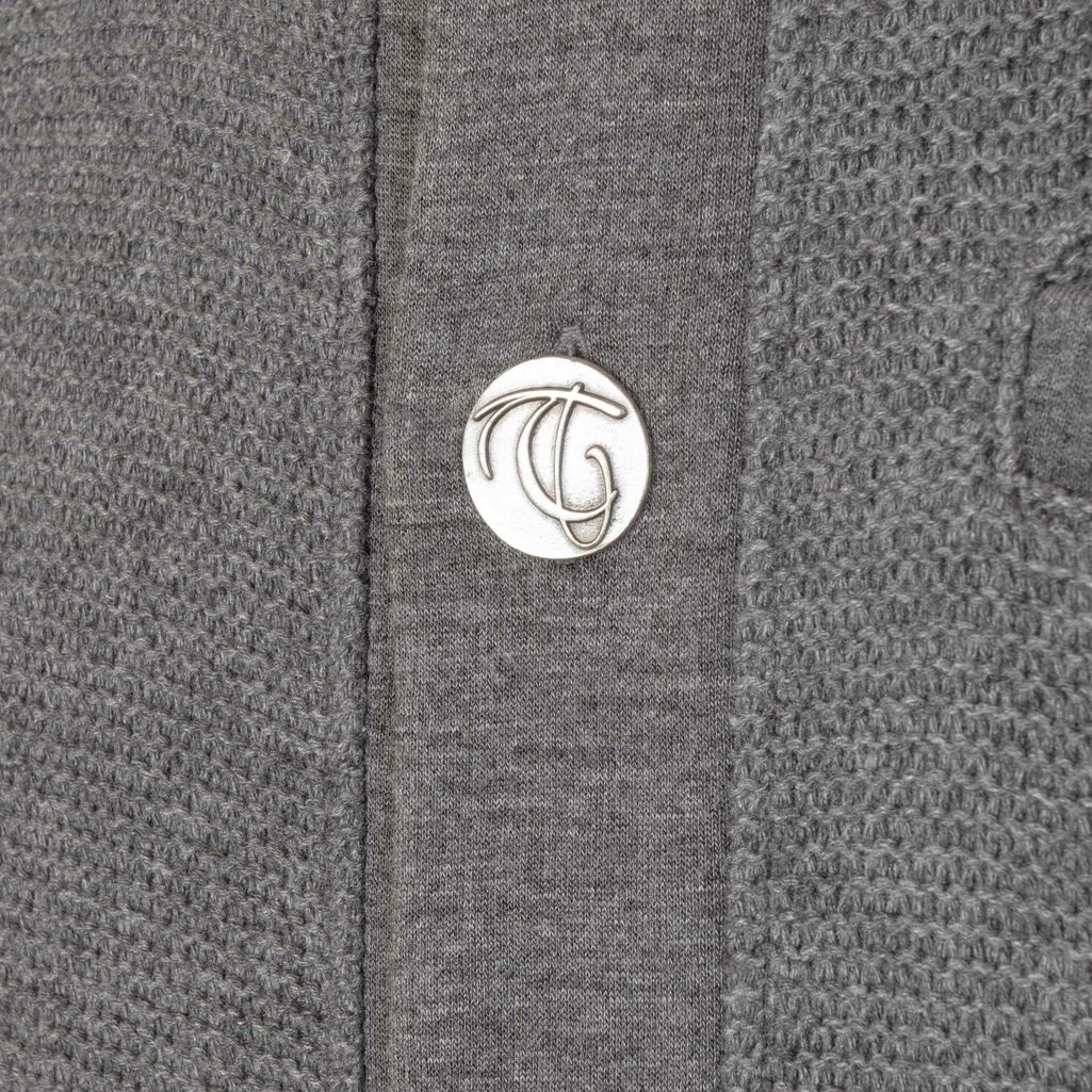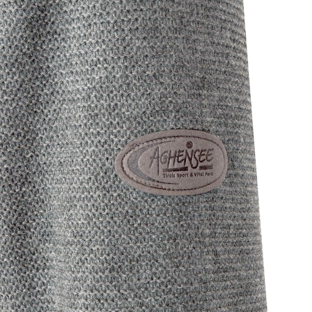 Graue, leichte Strickjacke mit Achensee Badge an der linken Schulter.